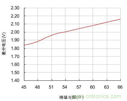 在負(fù)載電阻由45Ω不斷增大到66Ω時(shí),節(jié)點(diǎn)的輸出差分電壓也隨著由1.84V增大到2.16V,兩者近似線性關(guān)系。為了使發(fā)送節(jié)點(diǎn)的輸出差分電壓不至于過低,實(shí)際組網(wǎng)時(shí)負(fù)載電阻應(yīng)在圖 1測(cè)試的范圍內(nèi)波動(dòng)。我們分析RL的組成有3個(gè):終端電阻、總線節(jié)點(diǎn)的差分輸入電阻、總線本身的有效電阻。