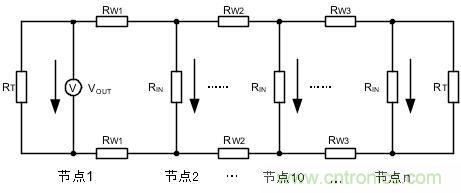 圖 4中,各節(jié)點(diǎn)的RW、RIN難以準(zhǔn)確確定,組網(wǎng)時(shí)以公式計(jì)算較為繁瑣,簡(jiǎn)便的方法便是測(cè)量總線兩端的節(jié)點(diǎn)電壓。如網(wǎng)絡(luò)的總線電阻過大時(shí),節(jié)點(diǎn)1到節(jié)點(diǎn)n總線對(duì)信號(hào)的損耗會(huì)很大,當(dāng)節(jié)點(diǎn)n接收的差分電壓低于1.2V時(shí),需要增大終端電阻。