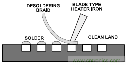 去錫。利用吸錫線和刀片型烙鐵去除焊盤上過多的焊料(參見圖6)。所選刀片的寬度應與器件占用的最大寬度相匹配。刀片溫度必須足夠低,以避免損壞電路板。可將焊劑涂在焊盤上,然后用吸錫線和烙鐵去除過多焊料。