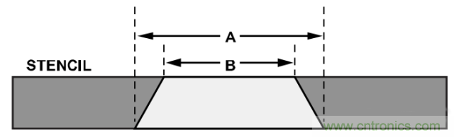 可利用模板來將焊膏涂敷到PCB焊盤上。模板對齊精度是使回流焊錫處理保持均勻的關鍵。使用與電路板裝配相同的PBGA孔徑幾何圖形和模板厚度。使用梯形孔徑(參見圖7)以確保焊膏均勻釋放并減少污點。