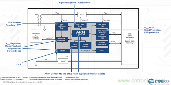 CCG3PA采用24引腳QFN或16引腳SOIC封裝,是一款適用于符合USB PD 3.0 標(biāo)準(zhǔn)的USB-C上的緊湊型系統(tǒng)級(jí)芯片,只需添加外部MOSFET和AC-DC轉(zhuǎn)換器即可成為一個(gè)符合最新USB供電標(biāo)準(zhǔn)的完整離線電源適配器/充電器。
