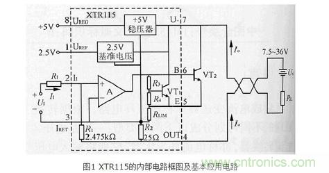 XTR115采用SO-8小型化封裝,其內(nèi)部電路框圖及基本應(yīng)用電路如圖1所示。U+為電源端,接環(huán)路電源。UREF為2.5V基準(zhǔn)電壓輸出端。II端接輸入電流。IRET為基準(zhǔn)電壓源輸出電流和穩(wěn)壓器輸出電流的返回端,可作為輸入電路的公共地。OUT為4~20mA電流輸出端。UREG為+5V穩(wěn)壓器的輸出端。B和E端為外部功率管的接口,分別接功率管的基極(B)和發(fā)射極(E)。功率管的集電極(C)接U+端。芯片內(nèi)部主要包括輸入放大器(A),電阻網(wǎng)絡(luò),輸出晶體管(VT1),2.5V基準(zhǔn)電壓源和+5V穩(wěn)壓器。RLIM為內(nèi)部限流電阻。外圍元器件主要有輸入電阻(RI),功率管(VT2),環(huán)路電源(Us)和負(fù)載電阻(RL)。輸入電壓UI先經(jīng)過RI轉(zhuǎn)換成輸入電流II,再經(jīng)過XTR115放大后從OUT端輸出4~20mA的電流信號。為減小失調(diào)電壓以及輸入放大器的漂移量,要求UI》0.5V