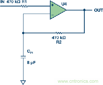 所有運(yùn)算放大器都有一定的輸入電容,包括差分和共模。如果運(yùn)算放大器連接為跟隨器,并且在反饋路徑中放入一個(gè)電阻以平衡阻抗,那么系統(tǒng)可能容易發(fā)生振蕩。原因是:大反饋電阻、運(yùn)算放大器的輸入電容和PC板上的雜散電容會(huì)形成一個(gè)RC低通濾波器(LPF)。此濾波器會(huì)引起相移,并降低閉環(huán)系統(tǒng)的相位裕量。如果降低得太多,運(yùn)算放大器就會(huì)振蕩。一位客戶在一個(gè)1 Hz Sallen-Key低通濾波器電路中使用AD8628 CMOS運(yùn)算放大器。由于轉(zhuǎn)折頻率較低,電阻和電容相當(dāng)大(參見(jiàn)圖3)。輸入電阻為470 kΩ,所以客戶在反饋路徑中放入一個(gè)470 kΩ電阻。此電阻與8 pF的輸入電容(參見(jiàn)圖4)一起提供一個(gè)42 kHz極點(diǎn)。AD8628的增益帶寬積為2 MHz,因此它在42 kHz仍有大量增益,它發(fā)生了軌到軌振蕩。把470 kΩ電阻換成0 Ω跳線即解決了問(wèn)題。因此,反饋路徑中應(yīng)避免使用大電阻。這里,何者為大取決于運(yùn)算放大器的增益帶寬。對(duì)于高頻運(yùn)算放大器,例如增益帶寬超過(guò)400 MHz的ADA4817-1,1 kΩ反饋電阻就稱得上是大電阻。務(wù)必閱讀數(shù)據(jù)手冊(cè)以了解其中的建議。
