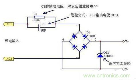 電容降壓式電源是一種非隔離電源,在應(yīng)用上要特別注意隔離,防止觸電。
