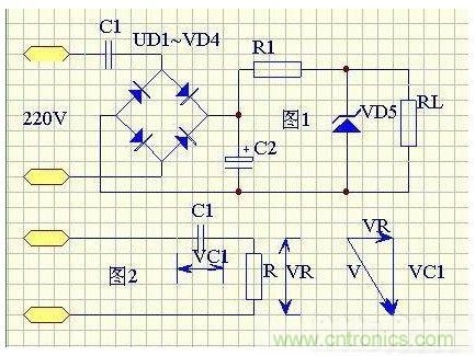 電容器,D2 為半波整流二極管,D1 在市電的負(fù)半周時(shí)給C1 提供放電