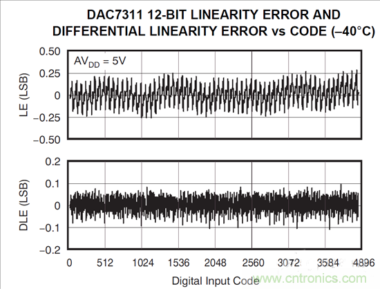 每個電阻器值的精確度可直接決定線性度。如果電阻串中任何一個電阻器的值不合適,我們就會在代碼轉換時發現相對于該電阻器的不良微分非線性度 (DNL)。此外,所有后續代碼的積分非線性度 (INL) 也會因為不匹配而產生失調。由于典型電阻串 DAC 設計中的電阻器數量龐大,我們不可能對每個電阻器都進行調整,因此只能接受一定程度上的 DNL 誤差。然而,仍然必須維持良好的 INL 性能,因此可經常對各組電阻器實施區域化調整,以避免調整每個電阻器,其在以下 INL 圖中呈“階梯”狀。