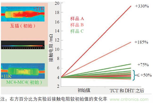從光伏連接器的外觀和質感可大致了解該產品的外形設計及絕緣材料的選擇。但是,評價光伏連接器好壞的核心指標是公母連接器對插之后的接觸電阻。一個高質量的連接器須具有很低的接觸電阻,并能夠長期維持這種低接觸電阻狀態。根據光伏連接器最新國際標準IEC 62852,公母對插后的接觸電阻在TC200+DH1000 測試后,增量不能大于5 mΩ或者電阻終值小于初始值的150%。而這僅是最低要求,不同廠商連接器的接觸電阻值取決于制造商的技術水平。對于如何評判接觸電阻,TC400(2×TC200)和DH1000 實驗提供了一個解讀方向。圖2 為實驗比較后的結果,由圖2 可知,高質量的光伏連接器的接觸電阻非常穩定,這主要得益于其所使用的電連接技術。因此,客戶在選擇光伏連接器時,須對其所使用的核心技術進行全面的了解。