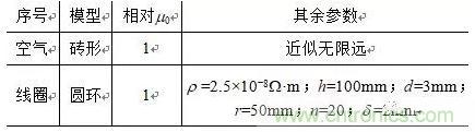 以XOY平面為圓平面,Z軸為高度建立線圈圓環模型,空氣模型為磚形,如圖1所示。通過布爾操作中的over運算將空氣介質與線圈澆筑在一起。材料屬性和模型參數設置見表1。