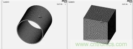 網格劃分對有限元的求解及其重要,單元越小,網格越細,則離散域的近似度越好,計算結果也越精確,但計算量及誤差都將增大。本文建立的線圈模型是一個規則的柱體,采用體掃掠方式劃分網格??諝饽P徒涍^澆筑之后形狀變得復雜,采用自由方式劃分網格。圖2為線圈和空氣的有限元模型,最后通過numcmp命令將其澆筑在一起。