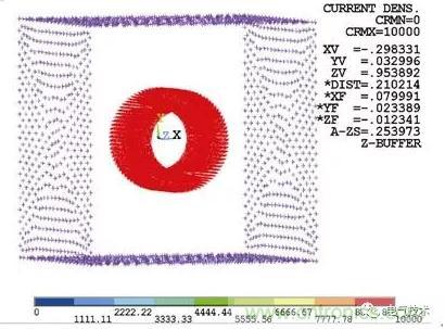 線圈作為載流塊導體,模型是柱形,所以加載電流時需加載環形電流。切換當前坐標系為柱坐標系,將環形電流加載在有限元單元上,電流方向水平向右。線圈單元采用電磁場分析操作選項,源電流密度可以直接加在有限元單元上,如圖3所示。