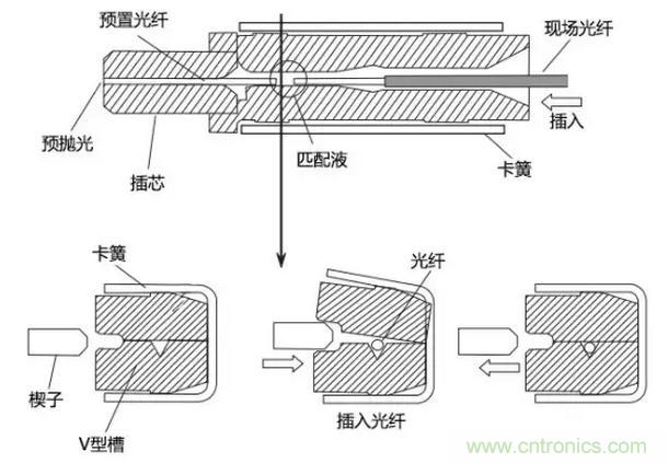 光纖快速連接器/冷接子可分為預置光纖和非預置光纖兩大類。預置光纖快速連接器/冷接子的接續(xù)點在連接器內部,并預置有匹配液;非預置光纖快速連接器/冷接子的接續(xù)點在連接器表面,不預置匹配液,直接通過適配器與目標光纖對接。非預置光纖快速連接器/冷接子的工作原理很簡單,這里不做贅述。下面詳細說明預置光纖快速連接器/冷接子的原理:如下圖所示,預置光纖膠接在插芯中,接續(xù)點設在放有折射率近似纖芯的導光材料-匹配液的V型槽中,從而實現(xiàn)預置光纖和目標光纖的無縫貼合。