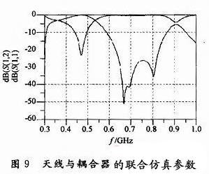 本文從s參數(shù)的角度分析了一個雙天線系統(tǒng)的去耦合方法,并通過一個天線設(shè)計實(shí)例,使用HFSS和ADS進(jìn)行去耦合前和去耦合后的仿真。結(jié)果顯示加入去耦合網(wǎng)絡(luò)和匹配網(wǎng)絡(luò)后兩個天線間的耦合可以降低至-35 dB以下,反射系數(shù)也可達(dá)到-15 dB以下,這滿足了工作于710 MHz的移動設(shè)備的要求。