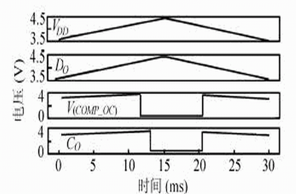 芯片的所有功能和主要參數均用HSPICE 進行了模擬驗證。圖8 給出了過充電保護檢測和釋放波形圖,圖9 給出了過放電保護檢測和釋放波形圖,其中COMP_OC 為過充電比較器的輸出信號,COMP_OD 為過放電比較器的輸出信號;芯片的過充電和過放電檢測精度約為30mV,在正常工作時消耗的電流為3.23uA,在待機狀態時消耗的電流為0.15uA。