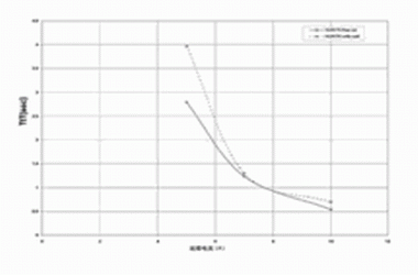 圖4顯示使用帶狀接腳(它們可能用在電池盒中),降低溫度轉換系數的結果。比較指出,帶狀接腳能在故障電流接近組件特定動作電流時,降低TtT,但此結果在較高電流時并不存在。