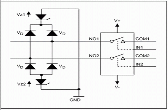 在現有設計中,大多數系統工作于標準電源電壓(單極性3.3V或5V,或雙極性±3.3V或±5V),這個電壓通常也是板上的最高電壓。在實際使用中,電路板的輸入端子可能會暴露于比電源電壓更高的電壓之下,同時,電路板電源被切斷后,輸入端子上的電壓有可能仍然存在。受這種過壓影響的第一個元件常常是多路復用器或開關,這就要求為開關元件和下游電路提供適當的保護。