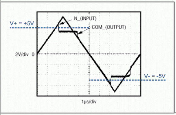 開關內部的兩個比較器用于監視輸入電壓,它們將輸入電壓與電源電壓V+和V-進行比較。當NO (常開)端或NC (常閉)端上的信號位于V+和V-之間時,開關正常工作。當信號電壓超出電源約150mV時(故障情況),輸出電壓(COM)被限制在電源電壓—保持相同極性且輸入為高阻。這是在故障比較器的控制下實現的,它在故障情況下關閉了N1和P1。故障比較器同時還按照以下規則控制鉗位FET (N2和P2):如果開關閉合時出現了負極性故障,接通N2連接COM到V-。如果開關閉合時出現了正極性故障,則接通P2連接COM到V+。如果開關開路時出現了故障,則輸出呈現高阻。