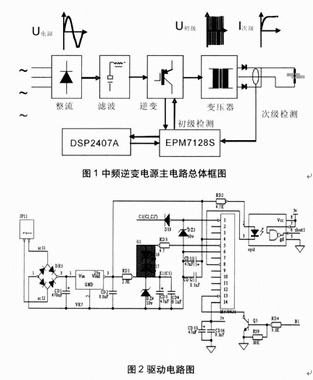中頻逆變直流電阻焊機的供電電源是由三相工頻交流電源經(jīng)整流電路和濾波電容轉(zhuǎn)換成直流電源,再經(jīng)由功率開關(guān)器件組成的逆變電路轉(zhuǎn)換成中頻方波電源,然后輸入變壓器降壓后,經(jīng)低管壓降的大功率二極管整流成直流電源,供給焊機的電極,對工件進行焊接(見圖1)。控制電路部分由DSP和CPLD組成,DSP(TMS320LF2407A)產(chǎn)生的PWM波和檢測信號、保護信號在CPLD(EPM7128S)里現(xiàn)實邏輯運算。
