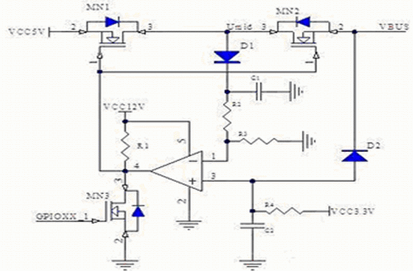 即當(dāng)VBUS大于3.3(R2+R3)/ R2 + UD1時,比較器便會將MOS管關(guān)斷。