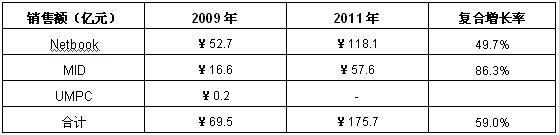 - 預計2009-2011年,中國超移動筆記本電腦市場銷售額的年均復合增長水平將達到59.0%。