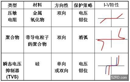 安森美半導體來自美國的ESD保護專家RobertAshton博士說,一般而言,ESD保護元件的分類可以通過其保護策略與方向性來進行,主要包括壓敏電阻、聚合物和瞬態(tài)電壓抑制器(TVS)等,如表1所示。在這幾種保護元件中,壓敏電阻在低電壓時,呈現(xiàn)出高電阻,其中的每個小型二極管兩端的電壓都相當?shù)停瑫r電流也相當小;而在較高電壓時,其中的獨立二極管開始導通,同時壓敏電阻的電阻會下降。從表1中我們也可以看出壓敏電阻為雙向保護元件。而對于帶導電粒子的聚合物而言,在正常電壓下,這些材料擁有相當高的電阻,但當發(fā)生ESD沖擊時,導電粒子間的小間隙會成為突波音隙陣列,從而帶來低電阻路徑。