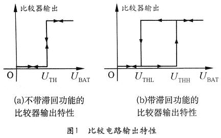 但如果在比較電路中設置兩個門限電壓:UTHH和UTHL(UTHH>UTHL),則可以形成一個滯回區,如圖1(b)所示。當電池電壓從低升高至UTHH時,比較器輸出高電平,打開電子開關,給負載供電;當電池電壓降低至UTHL時,比較器輸出低電平,斷開負載。這個時候電池端電壓雖然會迅速升高至UTHL以上,但由于達不到UTHH,所以,比較器仍然輸出低電平,負載仍被斷開,直到電池被充電后電壓升高至UTHH以上才能再次接通負載。這樣就避免了電路的振蕩,保護了負載和電池。