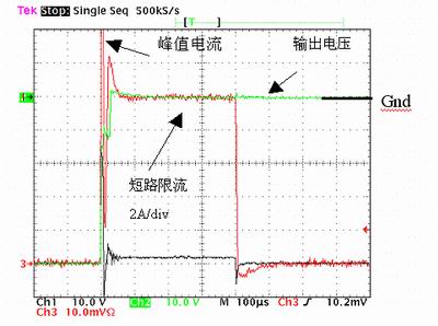 如果我們采用一個32mΩ的NTB52N10T4、100V的FET及一個5mΩ的感應電阻,在短路時FET的電流將被限制在10A,超過500μs斷路器就會關閉FET。圖2顯示-48V應用中的短路波形。