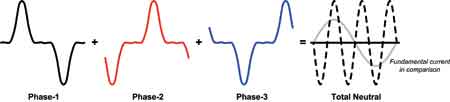 所有中性導線都并入配電板中的一個大直徑中性導線,就像一個變壓器一樣(見圖5)。在線性負載情況下,多相位系統的中性電流在一定程度上相互抵消。由于負載不平衡(見圖3),只有總中性電流的一小部分保留了下來。