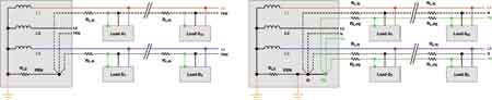 TN-C-S系統通過開啟配電板中一個額外的PE導線來降低GPD。此外,系統的中性和PE導線的星形連接有一個二次接地,從而降低了該點處的等電位并抵消了源線路阻抗RLS兩端PEN處的額外大壓降。