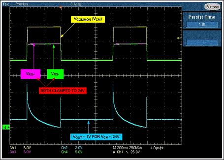 圖2是當移走D1時,35V拋負載脈沖下放大器的輸出。施加電壓為電池標稱電壓,所要求的輸出電壓為1V (輸入VSENSE = 50mV、增益 = 20)。出現拋負載電壓時,齊納管把輸入共模電壓鉗位在大約24V,放大器輸出經過幾個短暫的波動后穩定到0V。