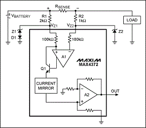 圖1. 該檢流放大器帶有保護電路(上部電路元件),適合于共模電壓高于30V的應用。
