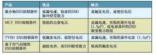 表 1給出了在靜電放電抑制器件中常用的幾種核心技術的優點和缺點對比。聚合物靜電放電抑制器件在各種技術中可提供最低的漏電流,可承受非常高的靜電放電電壓脈沖,但在多次靜電放電事件后器件會開始降級。除此之外,該類器件相對高的觸發電壓和鉗位電壓(比空氣間隙放電產品高出50~100倍)則意味著更多的靜電放電脈沖能量可以通過被保護的電路。