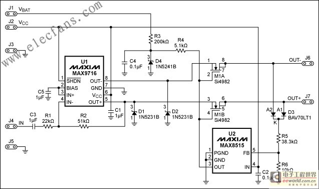 一個(gè)雙N溝道MOSFET斷開在回答有關(guān)任何輸出高電壓狀態(tài)下從線束放大器輸出。 MOSFET管(M1A及數(shù)M1B)一般上,用自己的驅(qū)動(dòng)11V的齊納二極管的(4點(diǎn))及其約11V的偏置元件。這種雙二極管D3提供了一個(gè)在每個(gè)輸出直流電壓二極管或連接,從而產(chǎn)生電壓,控制分流穩(wěn)壓器U2樂隊(duì)(MAX8515)輸出。所示的電路U1的保護(hù),一個(gè)1.4W功率AB類放大器(MAX9716)以上(聲音警告和汽車的司機(jī)的跡象)中提到的應(yīng)用場(chǎng)合。