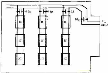 在單片機測控系統(tǒng)中使用了大量的數(shù)字IC,而每片數(shù)字IC本身都是一個脈沖干擾源,它們也會通過電源線相互干擾。解決辦法是在印制板電源進線端并聯(lián)一只10UF~100UF鉭電容進行電源退耦,同時在每個芯片的電源進線端再并聯(lián)一只高頻、低分布的電感的陶瓷電容,容量一般取0.1UF,當(dāng)頻率超過15MHZ時,可取0.01JF,電路如圖所示。退耦電容的引腳要盡量短。