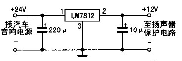 具體制作如下:先把功放輸出端與音箱的引線(xiàn)切斷,按圖2所示電路將引線(xiàn)頭a、b分別接功放的兩組輸出端,c、d分別接左、右聲道音箱:揚(yáng)聲器保護(hù)電路的電源只能從收放機(jī)中獲取,不可直接從汽車(chē)12 v電源中獲取,否則不起開(kāi)/關(guān)機(jī)保護(hù)作用;若是柴油車(chē)所配置的收放機(jī)(使用24 V電源),則要求增加一個(gè)降壓電路(見(jiàn)圖3所示),給揚(yáng)聲器保護(hù)電路供電,以免電源電壓過(guò)高損壞IC。