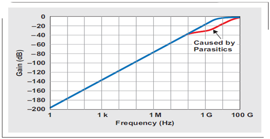 一次電路仿真證實了 RC 網(wǎng)絡為一個一階高通濾波器,其 C′1 和 R′1 為主要組件,頻率高達 100 MHz(參見圖 5 中藍色曲線)。超出這一頻率以后,寄生組件 C′2 和R′2生效,從而引起稍稍偏離于線性的斜率。因此,頻率達到 100 MHz 以后,增益響應可以表示為 VID/vn 的比:
