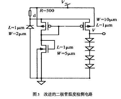 假設在總電路中標準的參考電壓為2. 0 V。則二極管溫度檢測電路的參數要調節到( V T + + V T - ) / 2= 2. 0 V。調節的方法很多,3 個用作鏡像電流源的MOS管的尺寸可以很方便的調節,MOS 管尺寸改變則流過二極管的電流就會改變,從而引起上下跳變點電壓的改變。甚至還可以調節二極管,比如去掉1 個二極管,就用3 個二極管來做溫度檢測。如圖3 所示的尺寸時,50 ℃時為2. 16 V ,120 ℃時為1. 535 V ,即V T + = 1. 535 V , V T - = 2. 16 V。則( V T + + V T - ) / 2= 1. 85 V ,不到2. 0 V。最方便的調節方法就是放大二極管前面1 個NMOS 管的尺寸。尺寸越大則跳變點電壓就越高。當然也可以調節另外的2 個MOS 管的尺寸。總之要使得( V T + + V T - ) / 2 = 2. 0 V。