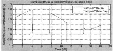 設檢測端電壓一般在10~50 V 之間變化,我們設置V(Detect)=SIN(30,20,50 k);周期為20μS;又設在采樣周期內,比較電壓為1 V;依據LDMOS管導通特性,設輸出漏電壓高于某值(本例為20伏)為過流,則分壓比設計為K = R4/ ( R3+R4)=5 k/(5 k+95 k)=1/20, 于是得到采樣電壓值為V(Sample)=V(Detect)*k =SIN(1.5,1,50 k),即最大值為2.5,最小值為0.5。同樣地,我們在采樣電路輸出端加上一個電容以消除電壓尖峰影響。該采樣電路仿真結果如圖6 所示。