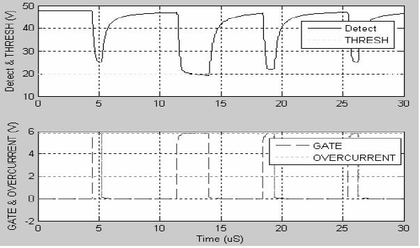 對圖3 進行電路仿真,電源電壓VCC 為5.8 V,LDMOS 漏端檢測電壓在10~50 V 之間,柵端電壓脈沖頻率為132 kHz,占空比為60%的方波,SPICE仿真條件設置為VCC=5.8 V,V (Detect)= SIN(30,20,50k),V (Gate)=PULSE(0,5.8,0.5u,0.5u,0.5u,3u,7u),仿真結果如圖8 所示。在1.26 uS~4.17 uS 和8.25 uS~11.2 uS 這兩個采樣區間內,采樣電壓V(Sample)較比較電壓V(Compare)大,輸出為低電平(過流保護,低電平有效);在15.2 uS~18.2 uS 采樣區間內,采樣電壓V (Sample) 較比較電壓V(Compare)小,輸出為高電平,對應不發生過流情況;其他時間段內柵電壓處于低電平,對應LDMOS處于關斷態,不可能發生過流,故過流輸出信號OverCurrent 為高電平。仿真結果表明,該電路確實能很好地實現過流保護的功能。