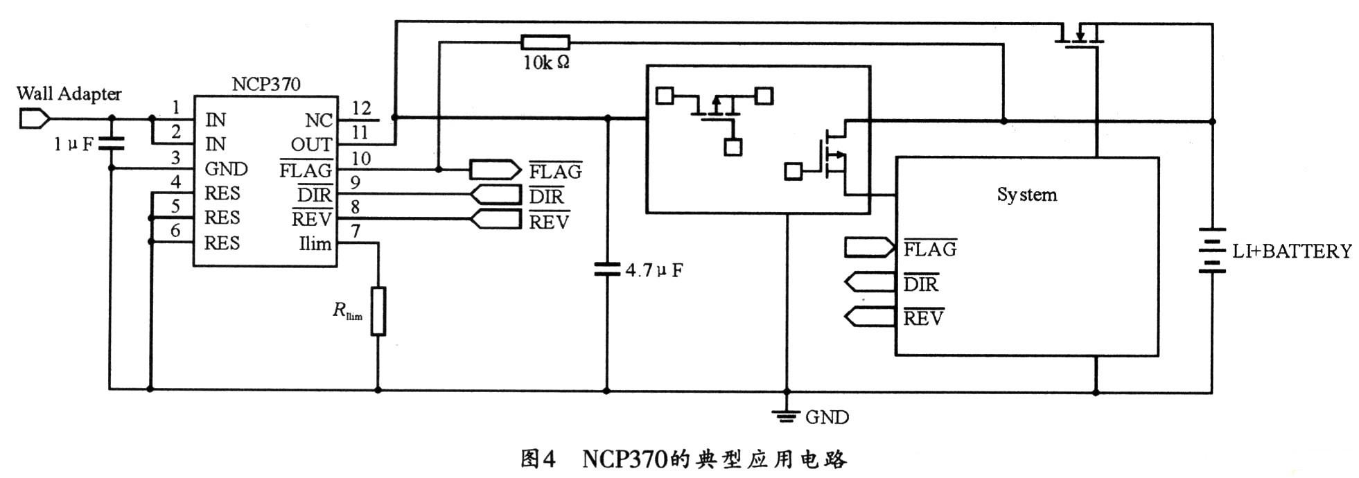 第二種為反向模式,即由系統(tǒng)電池或升壓器給外部設(shè)備提供電源的充電模式。在這種模式下,外設(shè)必須接到NCP370的輸入端(系統(tǒng)底部連接器),而電池則應(yīng)與其輸出端相連。同時,NCP370內(nèi)部的過流保護電路也會被激活,這樣可以防止外設(shè)故障和電池放電。另外,NCP370還帶有一個反向故障指示輸出端(FLAG),該端口可在故障發(fā)生時,用于向系統(tǒng)報警。若在其輸入端旁路一個1μF或更大的電容,NCP370還可以進行ESD保護(15 kV的空氣放電)。