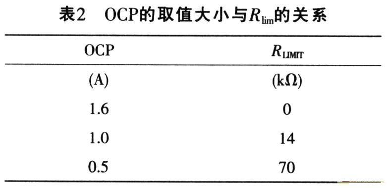 當外設(shè)電阻Rlim上的電流(Ilim)高于Iocp時,流過其內(nèi)部N溝道MOS管的電流就會受到限制,這樣,NCP370就能提供從電池到外設(shè)的反向過流保護功能。由于NCP370的內(nèi)部電阻與Ilim是串聯(lián)關(guān)系,因此,當Ilim引腳直接與GND相連時,其OCP最大,而在它們之間接入Rlim時,其OCP會減小,OCP的取值大小如表2所列。當電流高于OCP時,其內(nèi)部的NMOS會關(guān)斷,且/FIAG會置低,同時NCP370會通知微控制器來對故障進行處理,并禁止反向充電模式。
