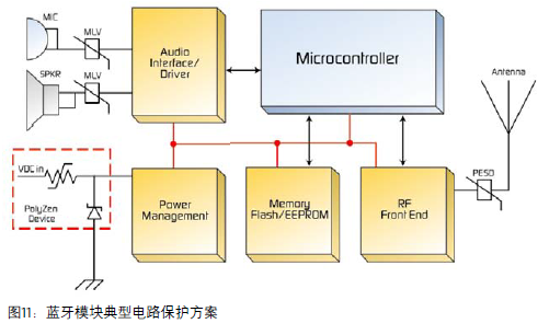 藍牙標準雖然最初并非為車載環境而設計,但已經為車輛和其系統之間進行溝通的移動電子設備創造了新的市場前景,如手機、MP3播放器和導航設備。保護暴露在外的通訊界面不受因天線和儀器無線(RF)界面所產生的ESD和其他電壓浪涌的影響是一個相當重要的設計問題。圖2顯示了一個PolyZen集成過電流/過電壓設備如何幫助保護藍牙模塊的功率輸入。MOV或表面安裝的MLV也可用于避免車載麥克風和擴音器界面上出現電壓瞬態。PESD設備可以用于避免電線出現ESD浪涌。