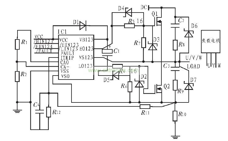 圖3是由IR2130組成的無(wú)刷直流電機(jī)驅(qū)動(dòng)原理圖為便于表示只畫(huà)出其中一個(gè)橋臂的電路示意圖,通過(guò)IR2130輸入信號(hào)控制MOSFET的開(kāi)關(guān),由此驅(qū)動(dòng)無(wú)刷直流動(dòng)機(jī)。C1是自舉電容,為上橋臂功率管驅(qū)動(dòng)的懸浮電源存儲(chǔ)能量,D1的作用是防止上橋臂導(dǎo)通時(shí)母線(xiàn)電壓倒流到IR2130的電源上而使器件損壞,因此D1應(yīng)有足夠的反向耐壓,當(dāng)然D1與C1串聯(lián)也是為了滿(mǎn)足主電路功率開(kāi)關(guān)頻率的要求,D1應(yīng)選快速恢復(fù)二極管。 R1、R2、R10、R11、R12、C4組成過(guò)流檢測(cè)電路。R5、R6為柵極驅(qū)動(dòng)電阻,D4、D5為功率管提供了一個(gè)低阻抗的放電回路,使功率管能夠快速的泄放電荷。
