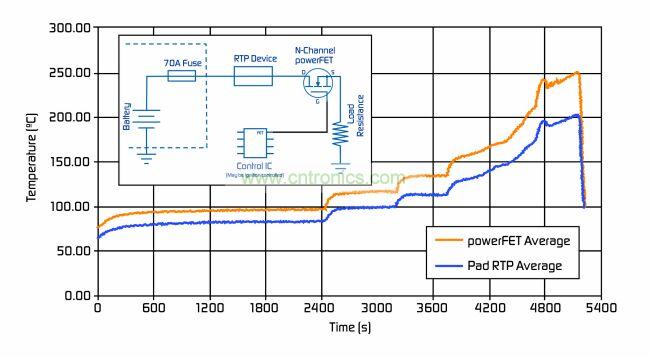 圖4:在緩慢的熱失控情況下,RTP200器件會追蹤powerFET溫度,當(dāng)溫度達(dá)到200℃時,它就會斷開電路。