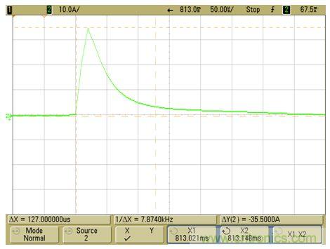 以下為實際應(yīng)用時量測到電源正常工作時的波形:電流尖峰 max 3.6A,寬度約為1.2ms;正常電流約為0.03A,正常工作時溫度可以達到85℃。