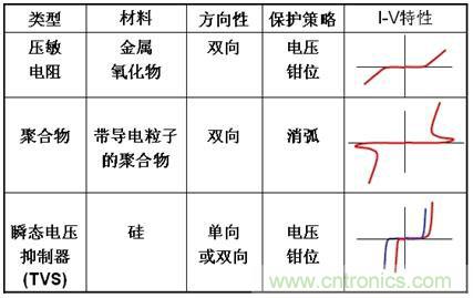 安森美半導(dǎo)體來自美國的ESD保護(hù)專家Robert Ashton博士說,一般而言,ESD保護(hù)元件的分類可以通過其保護(hù)策略與方向性來進(jìn)行,主要包括壓敏電阻、聚合物和瞬態(tài)電壓抑 制器(TVS)等,如表1所示。在這幾種保護(hù)元件中,壓敏電阻在低電壓時,呈現(xiàn)出高電阻,其中的每個小型二極管兩端的電壓都相當(dāng)?shù)停瑫r電流也相當(dāng)小;而在較高電壓時,其中的獨(dú)立二極管開始導(dǎo)通,同時壓敏電阻的電阻會下降。從表1中我們也可以看出壓敏電阻為雙向保護(hù)元件。而對于帶導(dǎo)電粒子的聚合物而言,在正常電壓下,這些材料擁有相當(dāng)高的電阻,但當(dāng)發(fā)生ESD沖擊時,導(dǎo)電粒子間的小間隙會成為突波音隙陣列,從而帶來低電阻路徑。