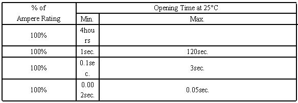 保險絲需要有一定的過載能力:UL規范保險絲的最大不熔斷電流是110%In; IEC規范保險絲的最大不熔斷電流是150%In或120%In保險絲也要求在超過限量的過載電流時能及時地燒斷:UL規范保險絲的最小熔斷電流在130%In 左右; IEC規范保險絲的最小熔斷電流在180%In 左右;