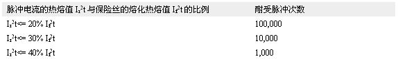 由于脈沖電流通過保險絲的時候,會產生熱量,所以雖然單次脈沖的能量不足以使保險絲熔斷,但多次脈沖沖擊會導致保險絲熔斷。為了保證保險絲可以耐受規定次數的脈沖電流,需要依據表3中所示的脈沖折減系數計算保險絲的I2t規格。如果脈沖發生時,保險絲所處環境溫度高于室溫(+25°C),須做相應的溫度折減。