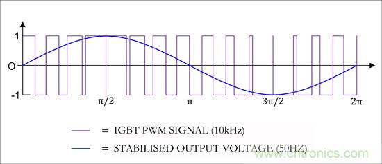 圖1:帶助推器和逆變器(頂部)的太陽能發(fā)電廠功能圖。每個(gè)IGBT驅(qū)動(dòng)器都有一個(gè)良好的帶隔離的DC/DC轉(zhuǎn)換器供電。設(shè)備通過一個(gè)高頻PWM信號(hào)控制,這個(gè)信號(hào)輸出平滑的正弦波(左)。