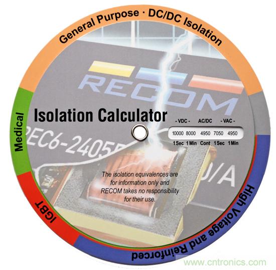 在某些規(guī)格書中,隔離電壓的測試時(shí)間有可能是1秒鐘或者1分鐘甚至是一個(gè)連續(xù)的長時(shí)間。測試加載時(shí)間越長,其測試電壓就會(huì)越低。為了使用戶能夠準(zhǔn)確地確定這個(gè)關(guān)鍵值,RECOM提供一個(gè)CD光盤尺寸大少的免費(fèi)ISO計(jì)算工具。一個(gè)隔離電壓時(shí)間規(guī)格的轉(zhuǎn)換器。只要發(fā)送郵件到info@recom-electronic.com 即可免費(fèi)索取ISO計(jì)算器。另外,在網(wǎng)站www.recom-electronic.com上也可以找到這個(gè)在線工具。