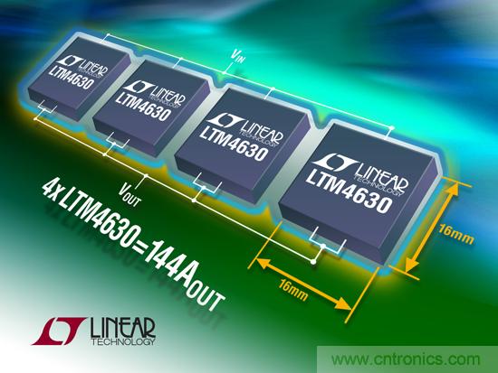 ●利用多個(gè) LTM4630 實(shí)現(xiàn)多相并聯(lián)均流,電流可高達(dá) 144A